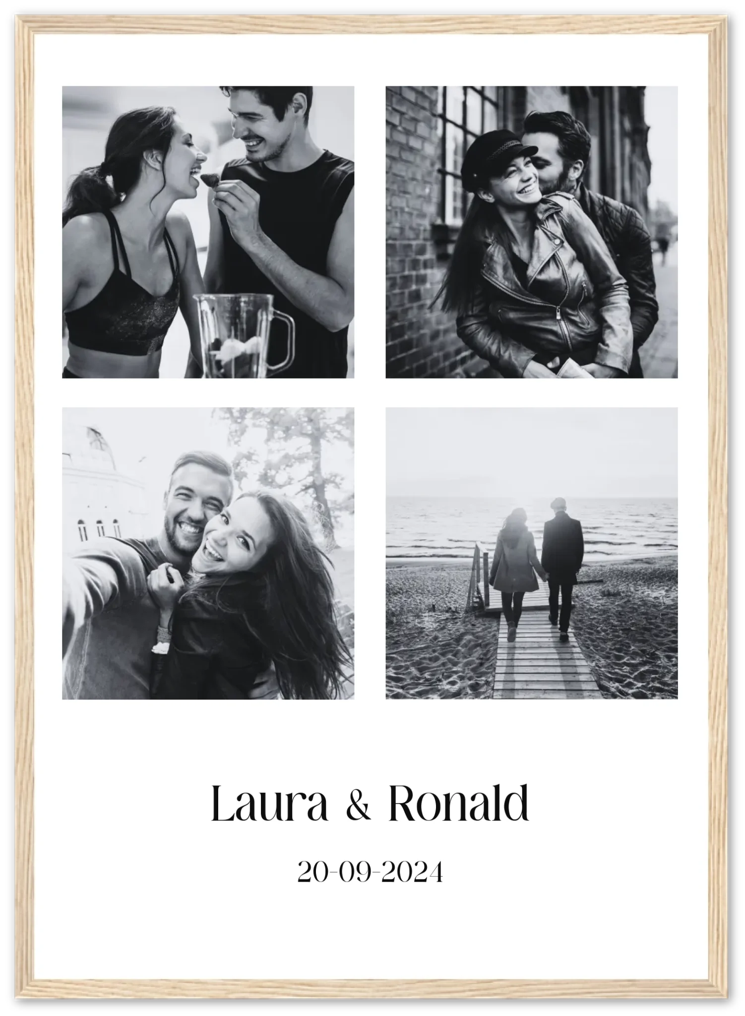 This unique framed poster lets you combine four of your favorite photos into a beautiful display. Add the names of your loved ones and, if desired, a special date to make it even more personal. Choose from a stylish black and white version, where your photos are automatically converted, or opt for a colorful version that makes your memories sparkle.