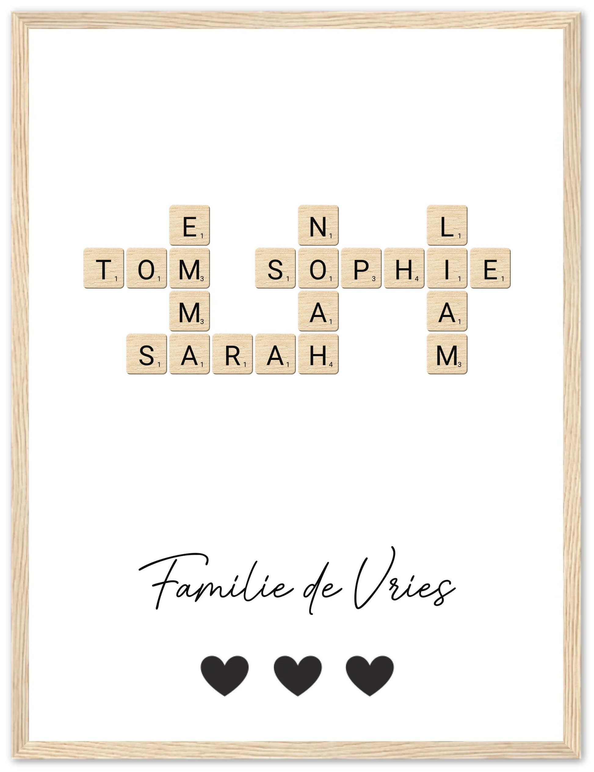 Deze bijzondere poster met lijst toont de namen van je gezinsleden in een stijlvolle Scrabble-opstelling.